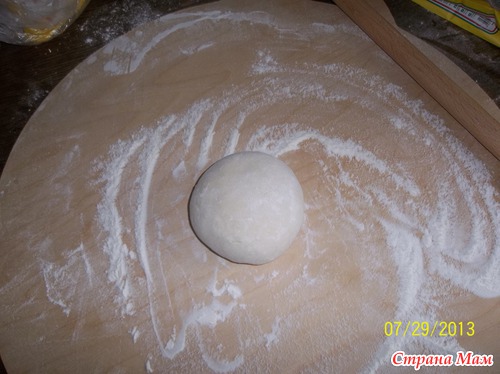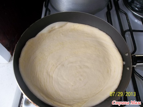 Далее этот слоеный шарик раскатываем размером в вашу сковородку, кладем в нее