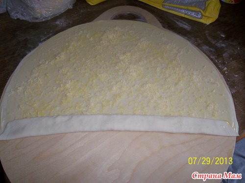 Раскатываем тесто тонко тонко, это удобно делать у кого есть доска специальная, как у меня. Раскатали, далее смажем топленым или просто распотленным сливочным маслом, посыпаем тертым сыром, вот так должно быть