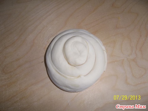 Далее с одного конца сворачивает наше тесто в тонкую колбаску, потом эту колбаску делаем вот в такой шарик