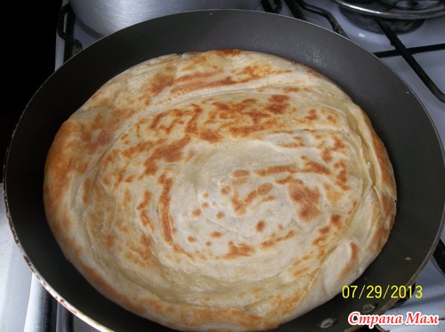 и ставим на медленный огонь, и постепенно переворачивая обжариваем нашу лепешку до готовности. Вот такая она должна быть