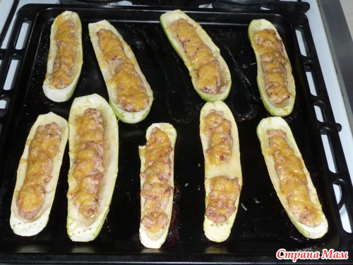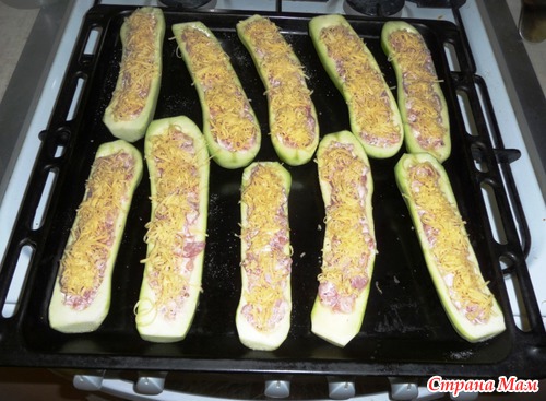 Кабачки режем пополам, вынимаем серединку и фаршируем.