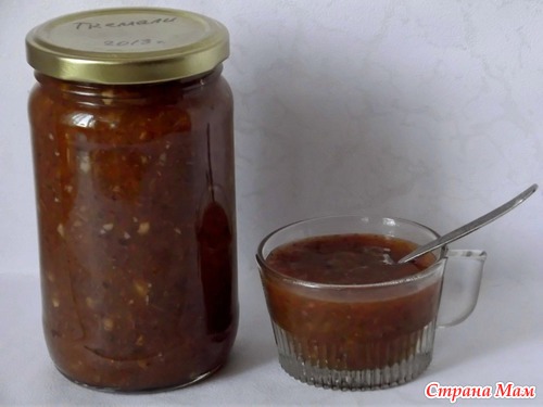Протёртое сливовое пюре поставить на огонь и прокипятить минут 30, чтобы стало густым. Далее рецепт. На 1 кг. протёртой сливы 1 ст. л. (с небольшим верхом) соли, 3 ст. л. сахара, 1 головка чеснока (дроблённого), 1 ст. л. молотых семян укропа, 1 ст. л. молотой кинзы, 1 ст. л. молотой сухой травы регана, 1 ч. л. молотого красного горького перца. Всё всыпать в сливовое пюре, перемешать и проварить ещё 5 минут.