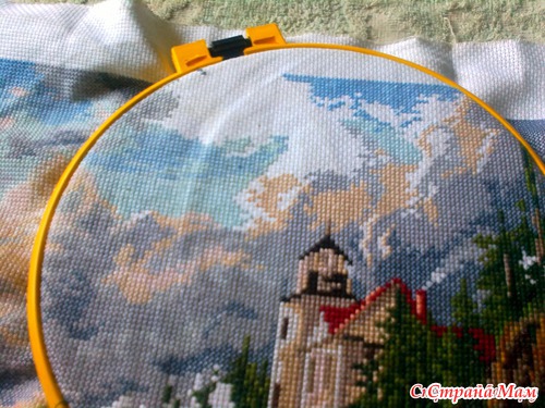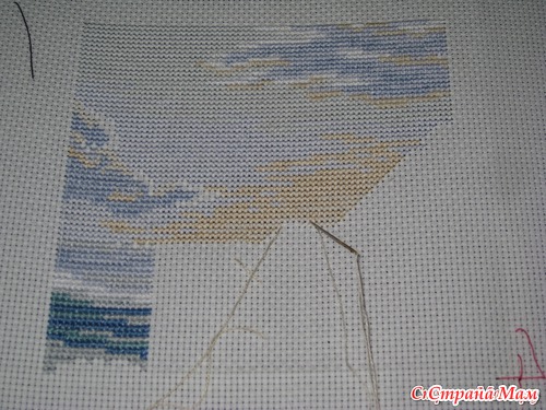 А с цветовой гаммой-самое сложное было, из всех тканей выбивается и резко контрастирует голубой и персиик, а белая канва вообще контраст со всем, а потому пришлось в пастельных тонах чего то делать, хотя тянуло на сине-бирюзовую морскую гладь. Ну это другим разом, т.к. у меня есть ещё парочка морских задумочек