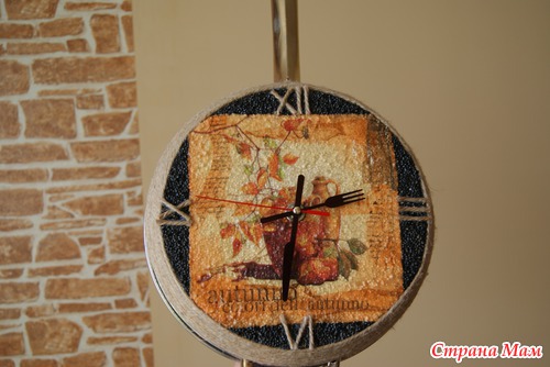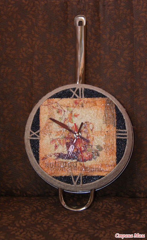 Использовала сковородку, механизм от старых часов, новые стрелочки, пшено на пва, салфетку, веревку, клей-пистолет и лак акриловый.