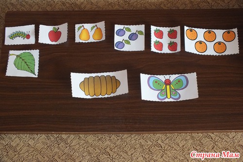 Читали произведение Очень голодная гусеница. И раскладывали картинки - последовательности. В очередной раз считали от 1- 5. К сожалению не смогла найти ссылку где скачала картинки, поделюсь материалами у себя в дневнике