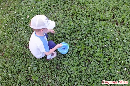 На прогулку взяла с собой игрушечных насекомых и ведерко. Раскидала их по траве, Андрюша искал их и собирал. В интернете видела идею собирать насекомых щипцами. У нас их нет, ну и ничего страшного.