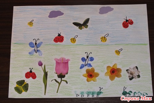 Совместный коллаж. Работа 50 на 50. Андрюша пальчиками делал отпечатки и украшал наклейками, остальное доделывала сама.