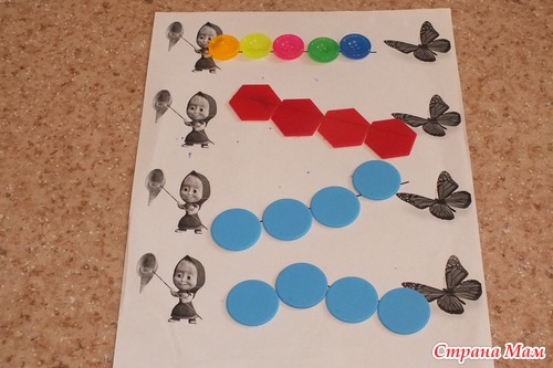 Проводилками в этот раз Андрюша заниматься не захотел, выкладывал дорожки из пуговиц и геометрических фигур.