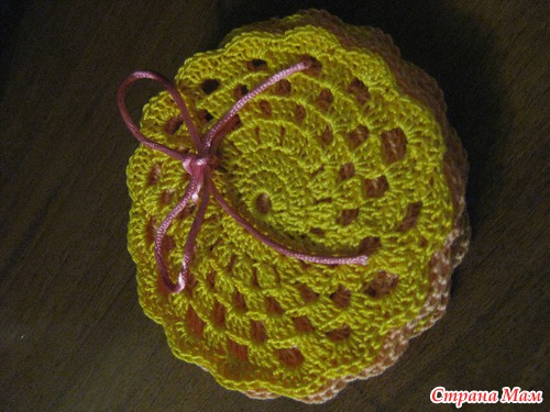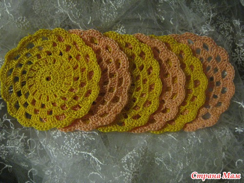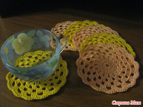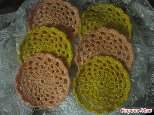 Как то сидела на роботе бес дела, а в тумбочке нашелся крючок и нитки - и вот за придуманной схемой получилось пару ну очень простеньких салфеточек под чашечки )))))
