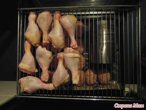 - сверху на решетку кладем окорочка...вот, как то так...