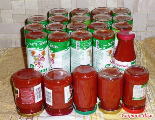 Из этого количества овощей у меня получилось 6 л. соуса. Разложила я его в 200 граммовые бутылочки из под детского кефира.