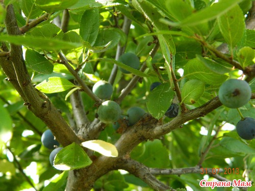 Мне по наследству от предыдущих хозяев достался куст -не знаю, что это такое. Похоже на терновник, только колючек нет. Ягоды маленькие как вишня, сине-сизые, практически на стволе сидят.