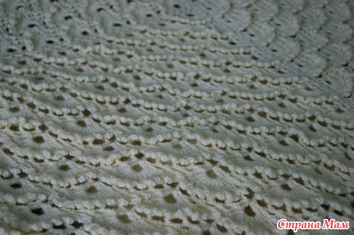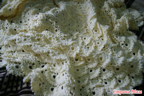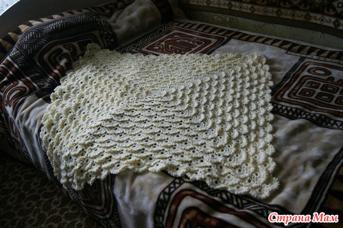 Связан кружевным узором чешуйки, которые налагаются друг на друга и придают пледу 3D объем. Связан из шерсти с акрилом, благодаря чему очень теплый и мягкий.