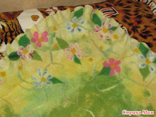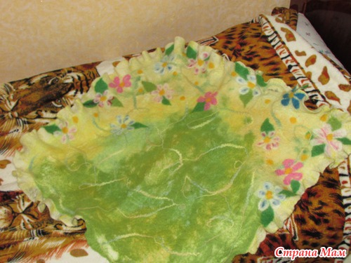 сначала выложила цветы, потом тонким слоем шерсть на нужной площади, по периметру проложила шерсть для воланов. Выложила сверху марлю и на нее еще слой шерсти. Потом все ВШМ погудела (соседям по голове ), помяла, кипяточком пополивала, снова мяла и результат перед вами)
