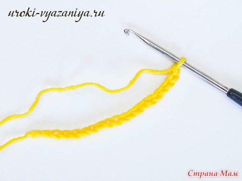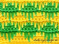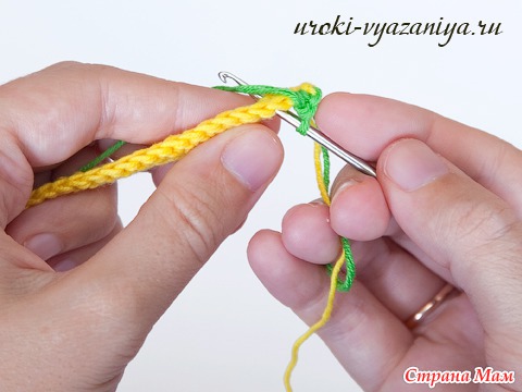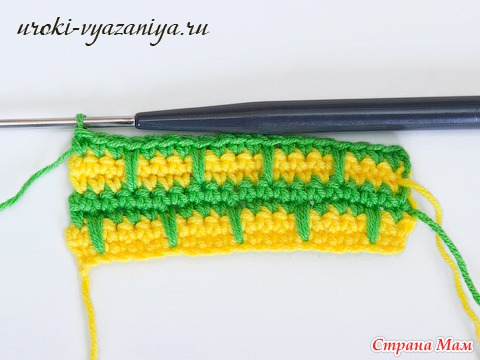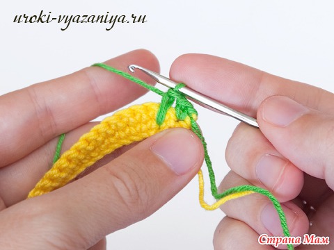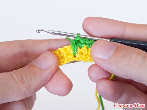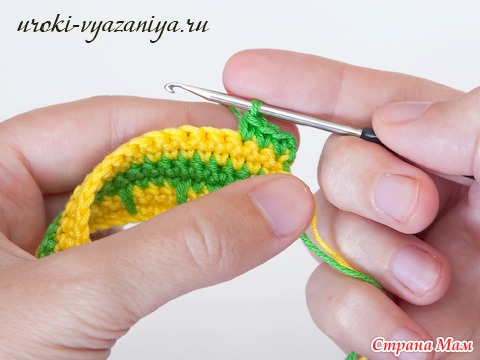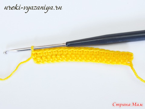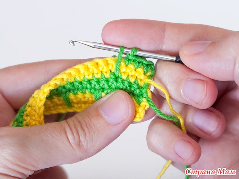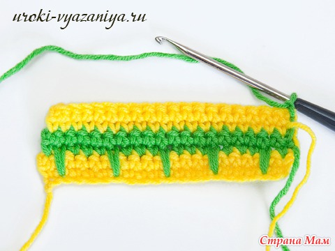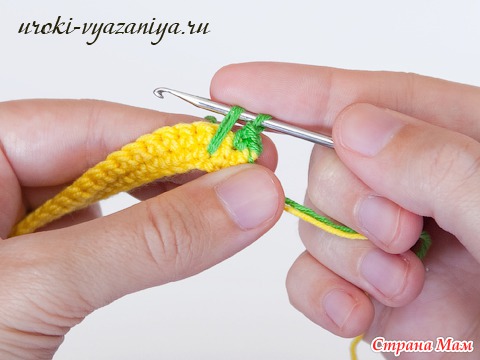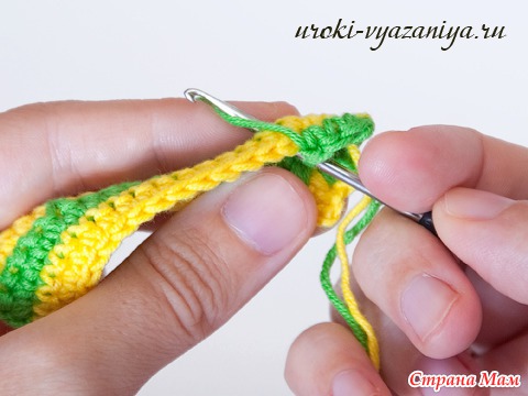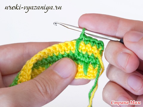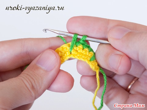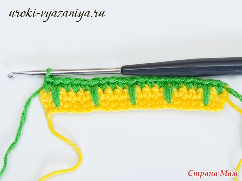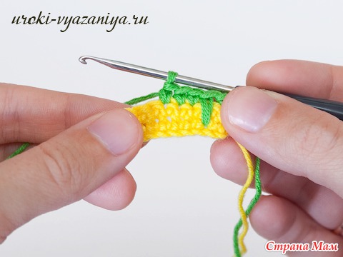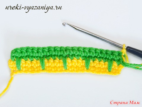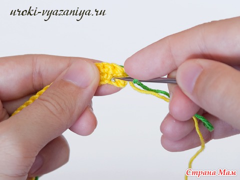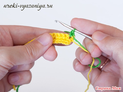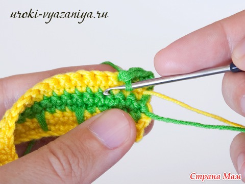 5 и 6 ряды вяжем ст. б/н нитью желтого цвета. В конце ряда меняем цвет нити.