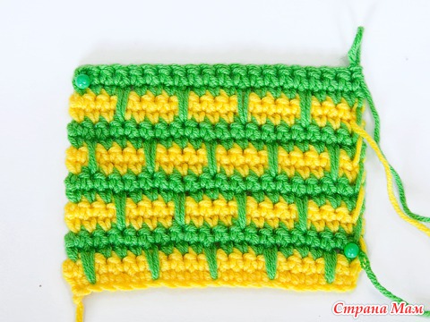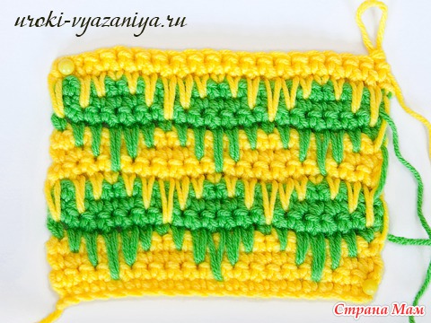 5 и 6 ряды вяжем ст. б/н нитью желтого цвета. В конце ряда меняем цвет нити.