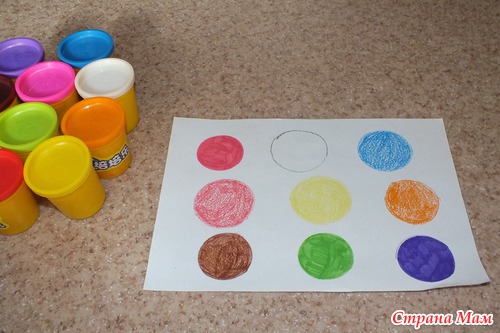 Не забываем повторять цвета. Это задание очень понравилось Андрюше. Расставлял баночки с тестом для лепки на цветные кружочки. Выполнил раз 10.