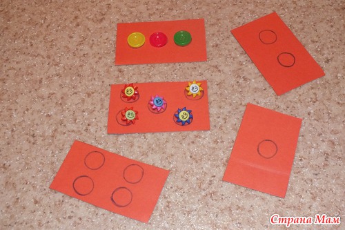 Вот еще один вариант карточек. Мы раскладывали и считали пуговицы. Вместо пуговиц можно взять помпончики, фасоль или делать пластилиновые точки.
