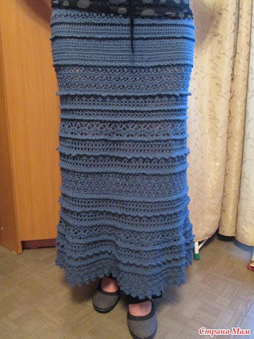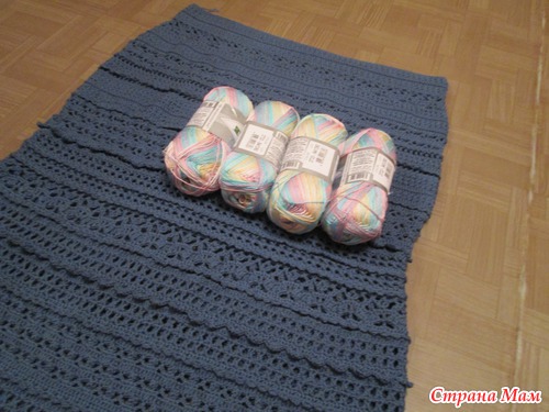 Вообще история и с пряжей была просто интересной! У нас весной закрывался отдел с нитками и вот прикупила 6 моточков этой серо-синей и 4 цветной. Почему-то еще весной захотелось связать длинную юбку.