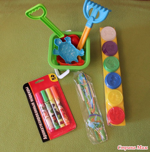 А вот и сами подарочки!!! Набор для песочницы, браслетик, Диане маркеры (к школе пригодятся) и масса для лепки!