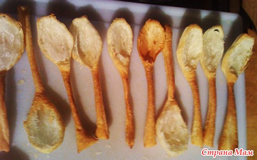 Можно конечно приготовить и съедобные ложки (заранее) из слоеного охлажденного теста. Раскатайте тесто, вырежьте по шаблону ложки и эти заготовки разложите по ложкам. Ложки смазывать не нужно.