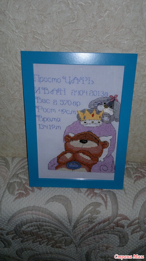 Метрику вышивала для знакомой. Выбирала она сама. Схема из альбома группы. Более десяти лет в браке, не было детей. И вот когда человек смирился и решил что все. Вроде уже возраст ей 40. Забеременела и родила сыночка. Я думаю ей святая Матрона помогла. К нам в город ее мощи привозили. И она у нее просила помощи. Вот чудо и свершилось. Растет теперь Иван царевич на радость родителям. Спасибо что заглянули.