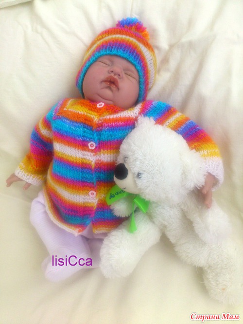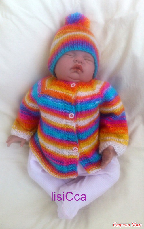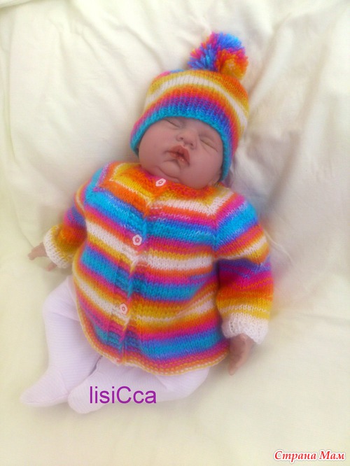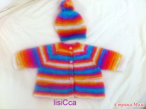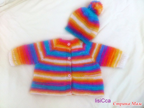 Комплект состоит из веселой кофточки и шапочки с озорным помпоном, связан вручную из детской гипоаллергенной пряжи. Подойдет как девочкам так и мальчикам. Цена 950 рублей. Возраст 0-3 месяца.