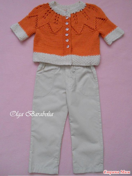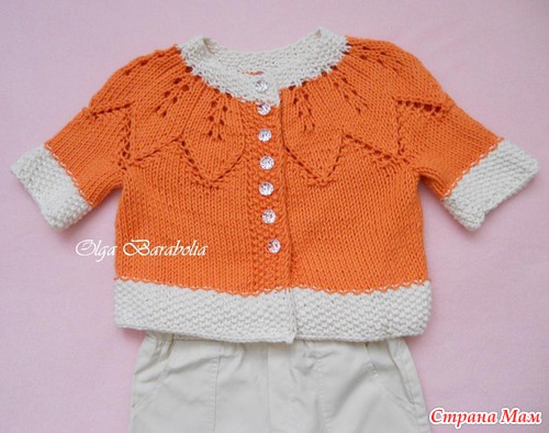 . Купила я в своем любимом магазине 3 моточка по 50 гр (80 м) фибронатура симба 10% мерсеризованный хлопок за очень смешную цену 2 оранжевых и 1 молочный. Вооружилась спицами 4,5 и получился вот такой милый жакетик.Ниточка великолепная, из той категории, что вяжется сама!