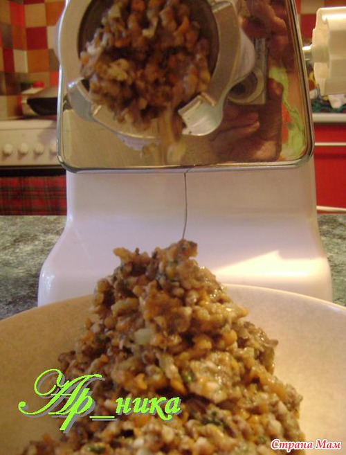 Пропускаем через мясорубку (можно воспользоваться блендером, но мне нравится мясорубка):