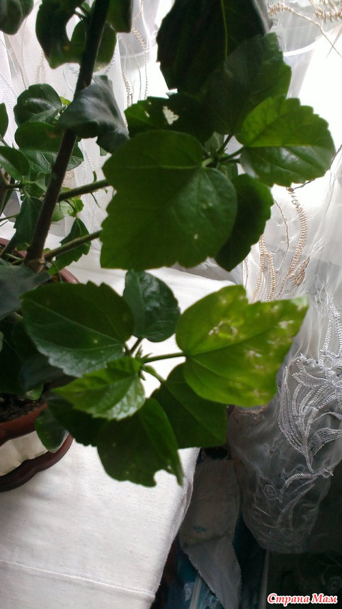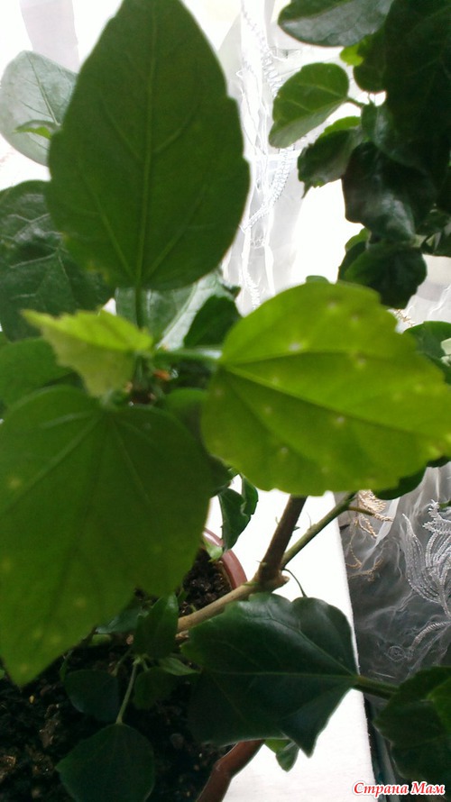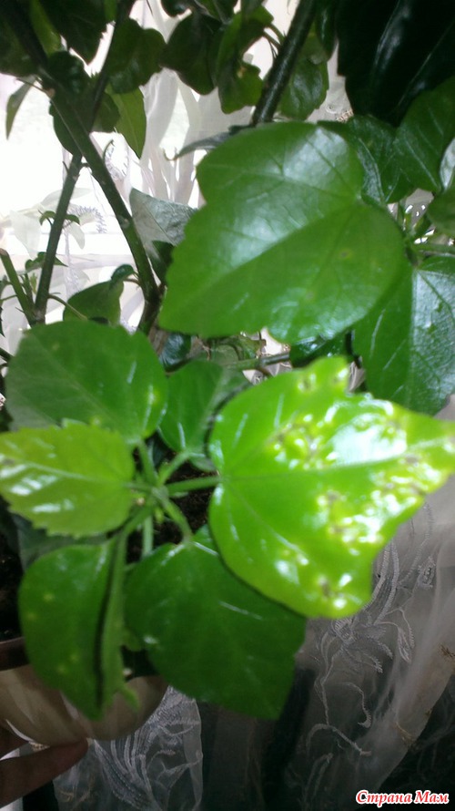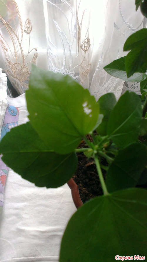 Здравствуйте страно мамочки! помогите пожалуйста. купила я уцененный гибискус. пересадила его дома. и вот. что происходит. сначало все бутоны опали. листики свернутые какие то. стали молоденькие листики появляться и такое ощущение что их кто то кушает