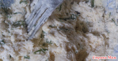 Яйца взбиваем с солью в легкую пену и смешиваем с творогом. Муку смешать с разрыхлителем и добавить к творогу. Укроп вымыть, слегка высушить, мелко нарезать и добавить в тесто. Хорошо перемешать.