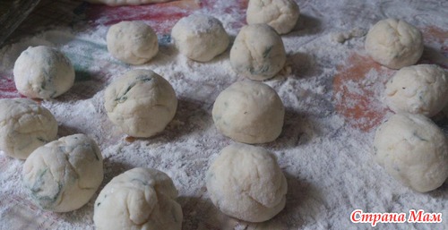 Стол слегка присыпать мукой, руки тоже, и накатать шарики величиной с перепелиное яйцо, можно чуть больше.