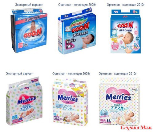 Отличить экспортный вариант от японского не составит большого труда. Поскольку японский вариант ориентирован, прежде всего, на японского потребителя, то оформление и описание свойств подгузника только на японском языке. Надписи на упаковке экспортного продукта выполнены на английском, китайском и индонезийском языках.