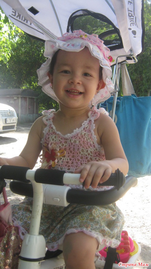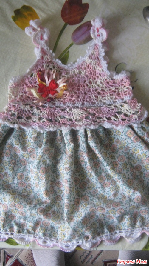 Здравствуйте. Ну вот и у нас появился комбинированный сарафан. Не судите строго шить совсем не умею. Это мой первый комбинированый сарафан. Знаю что для девочек нужно поярче наверно сарафанчики. А у нас получился сарафанчик для прогулок во дворе.
