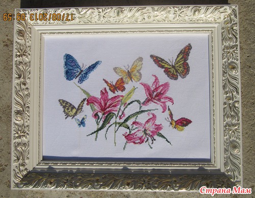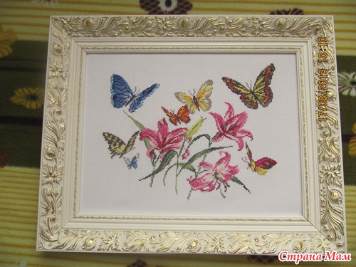 Когда лежала в январе в больнице с дочкой начала вышивать эту работу, а вернувшись забросила её. И вот сейчас опять вспомнила про своих бабочек и решила закончить. Вышивалось на одном дыхании. Это набор от Чудесная игла под названием Лилии и бабочки, но я называю эту работу На крыльях счастья.