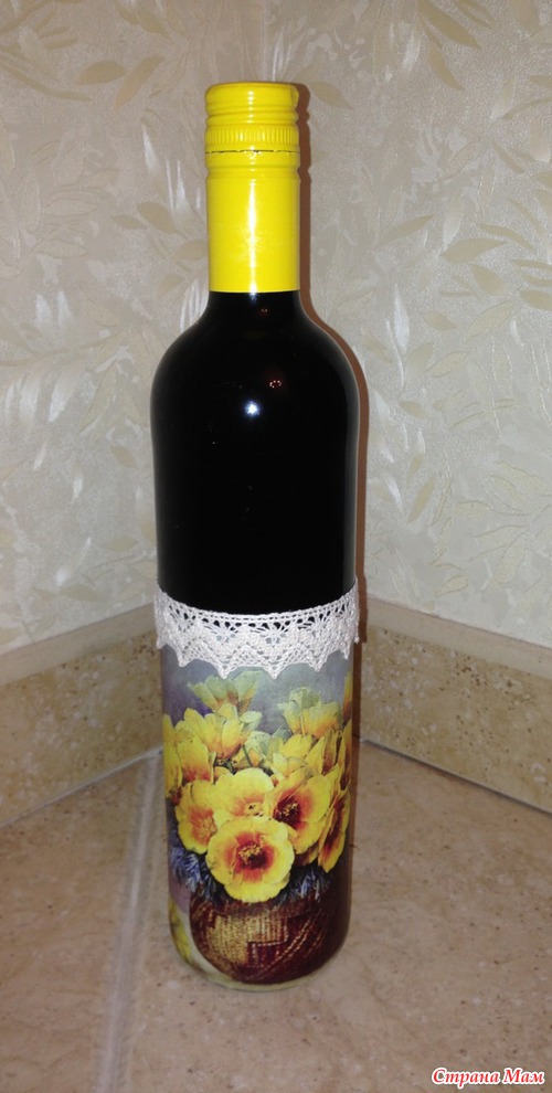 Красивая бутылка!!! Но девочки правы "в верхней части чего-то не хватает..."...там, где желтый верх. А то, что задекорирована только половина бутылки, мне очень нравится, хорошая идея