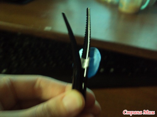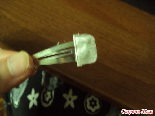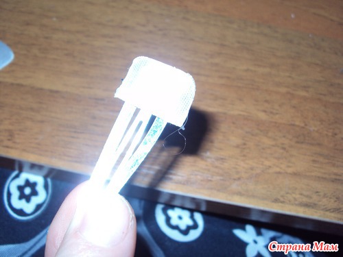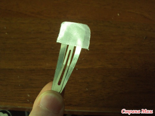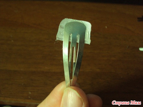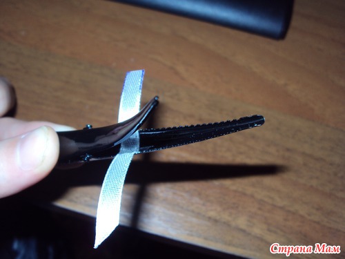Берём ленту шириной 6 мм и длиной 5 см. Вставляем между двух зубчиков крокодильчика, преварительно намазав ленту клеем в месте её соприкосновения с бОльшим зубчиком. Хорошо прижимаем.
