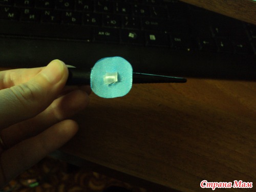 Вырезаем круг основу(размер зависит от цветка, который собираетесь крепит), опаляем край. прорезаем два отверстия на расстоянии примерно 5мм. Продеваем в них конечки от нашей ленточки и обрезаем их, оставляя около 5 мм с каждой стороны.