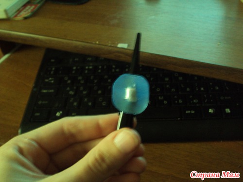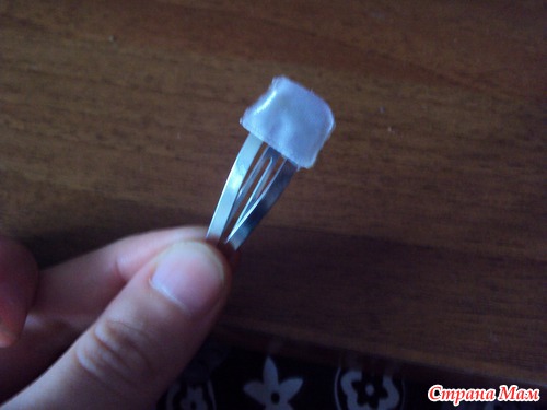 Берём ленту шириной 6 мм и длиной 5 см. Вставляем между двух зубчиков крокодильчика, преварительно намазав ленту клеем в месте её соприкосновения с бОльшим зубчиком. Хорошо прижимаем.