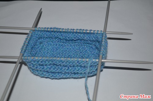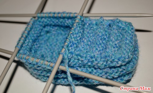 Чтобы сильно не намудрить с длиной, вязание начала с подошвы, следующим образом(пока в работе только 2 спицы):