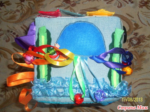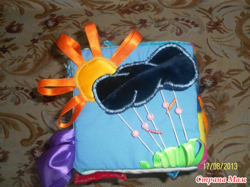 Солнышко (внутри ватный диск), тучка шуршит, дождик-шляпная резинка с бусинками.