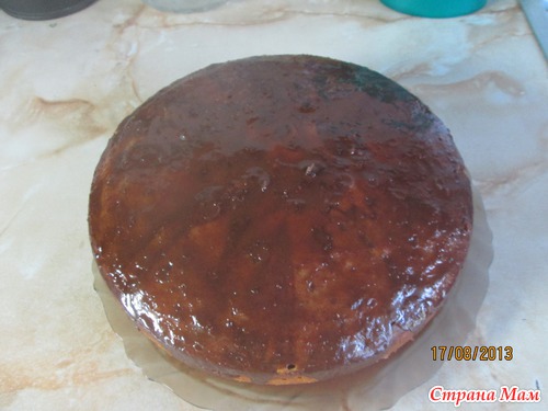 Для этого смешиваем 4 ст. л. молока, 2 ст. л. сахара и 1 ст. л. какао. На слабом огне доводим до загустения. Добавляем 50 г. сливочного масла, хорошо перемешиваем и поливаем наш тортик.