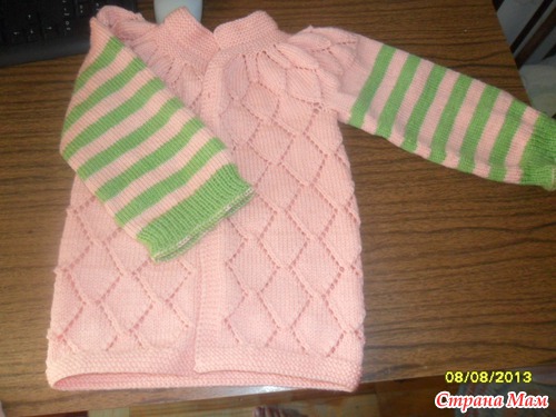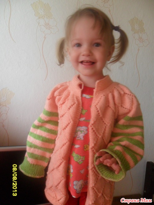 Связала кофточку из он-лайна. Связана на вырост, только без пуговиц. Не много изменила довязала воротник и рукава связала в полосочку так как пряжи было мало. К сожалению рукава в ромбик не получились. Но мне и дочери и так нравиться. Он-лайн проходил здесь https://www.stranamam.ru/post/3961520/#comments_form.