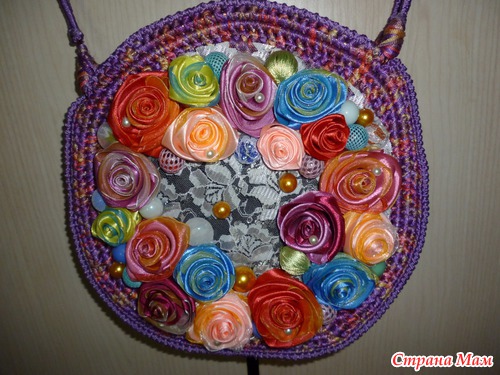 Связала вот такую сумочку дочери, пересмотрела весь материал предоставленный Светланой Трегуб и решилась, но на дочери поэксперементировала взяла не атласные ленты, а ленточную пряжу(выходит грубоватое полотно, но для сумки самый раз) потом было множество масстер классов из интернета и вот что получилось. Правда с ручками произошла промашка дома под руками ничего подходящего не оказалось пришлось проволоку обвязывать, хочу на шнур гусеничку переделать.