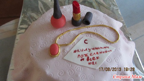 Этот тортик я приготовила для крестной моего мужа. Она живет в России и приезжала к нам погостить на 2 недельки. Вчера мы делали проводы и на этот вечер и был приготовлен тортик. Она лидер компании Мери Кей, поэтому тематика была выбрана не случайно. Единственное "но"- что для изготовления было очень мало времени, поэтому работа не очень тонкая и аккуратная. Но всем гостям очень понравилось, даже предлогали ейй забрать украшения с торта домой на память, но естественно, что их просто так не довезешь...