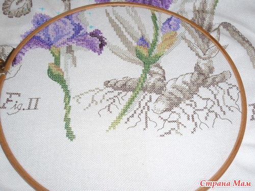 самым трудным для меня далась корневая система ириса, при её вышивании страдала моя нервная система