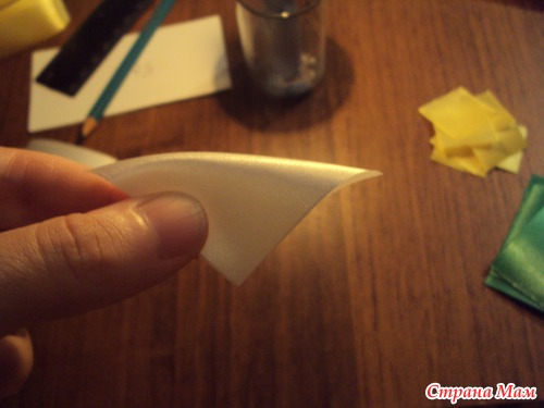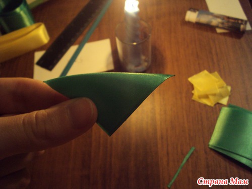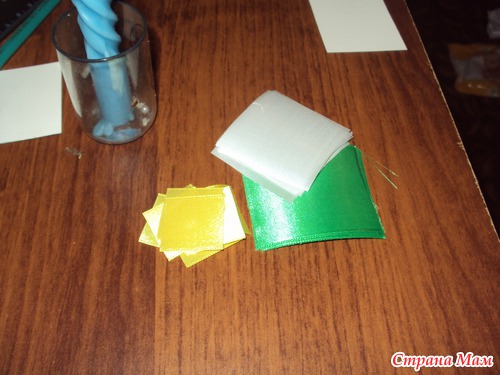 Итак, нарезаем ленты на квадраты - 8 квадратов 5*5 см белых, 6 квадратов 5*5 см зелёных, и 10 квадратов 2,5*2,5 см жёлтых. Не забудьте опалить срезанные края, чтобы лента не сыпалась!