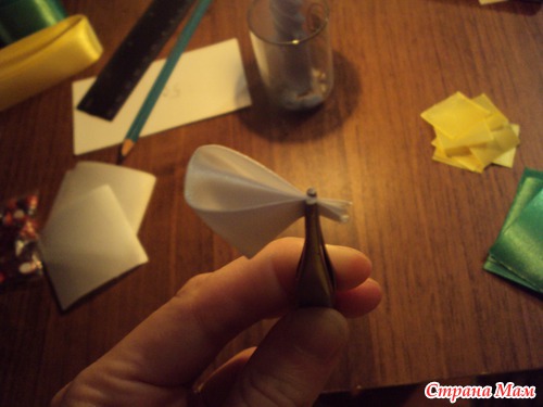 Начинаем собирать нашу ромашку. Я приклеиваю сразу к основе(но можно сначала собрать все лепестки на нитку) сначала два лепеска вот таким образом.