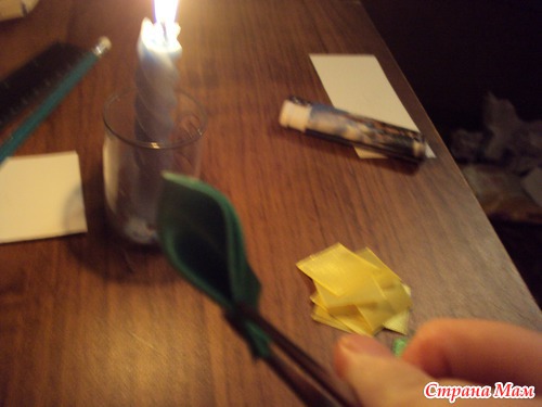 Теперь берём наши зелёные лепесточки, склееные между собой, намазываем СВЕРХУ носик клеем приблизительно на 5 мм.