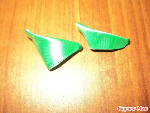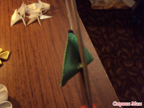 Затем склеиваю зелёные лепесточки по три между собой вот таким образом! ( я сначала склеиваю два носиками друг с другом, а потом намазываю носик третьего клеем и вставляю его между первых двух)
